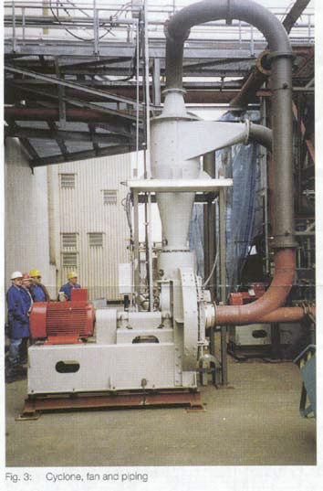 Die Grobteile fallen in einen offenen Container, der von Zeit zu Zeit entsorgt werden muß. Eine entscheidende Verbesserung der Systemperformance brachte der in Strömungsrichtung hinter dem Sichter installierte Zyklon (Bild 3). Das Material wird im Bypass zum Ventilator gefahren, d.h. über den Ventilator wird nur Luft gesaugt. Das Restholz dagegen wird im Zyklon abgeschieden und über eine Spezial-Messerschleuse sowie einen neukonstruierten und optimierten Aufgabeschuh wieder in den Luftstrom eingemischt.